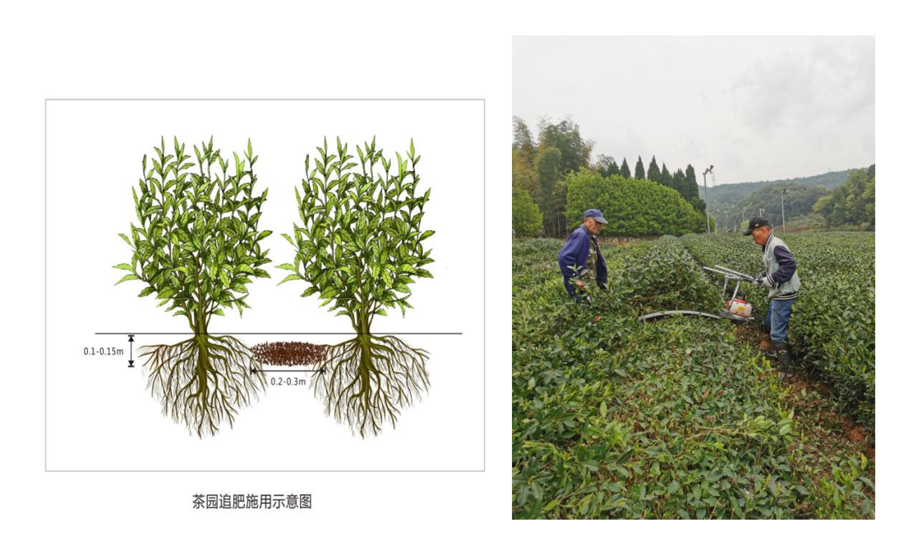 在茶蓬边缘垂直处开浅沟(5-10cm),施后覆土。有坡度茶园施用在茶行上部。