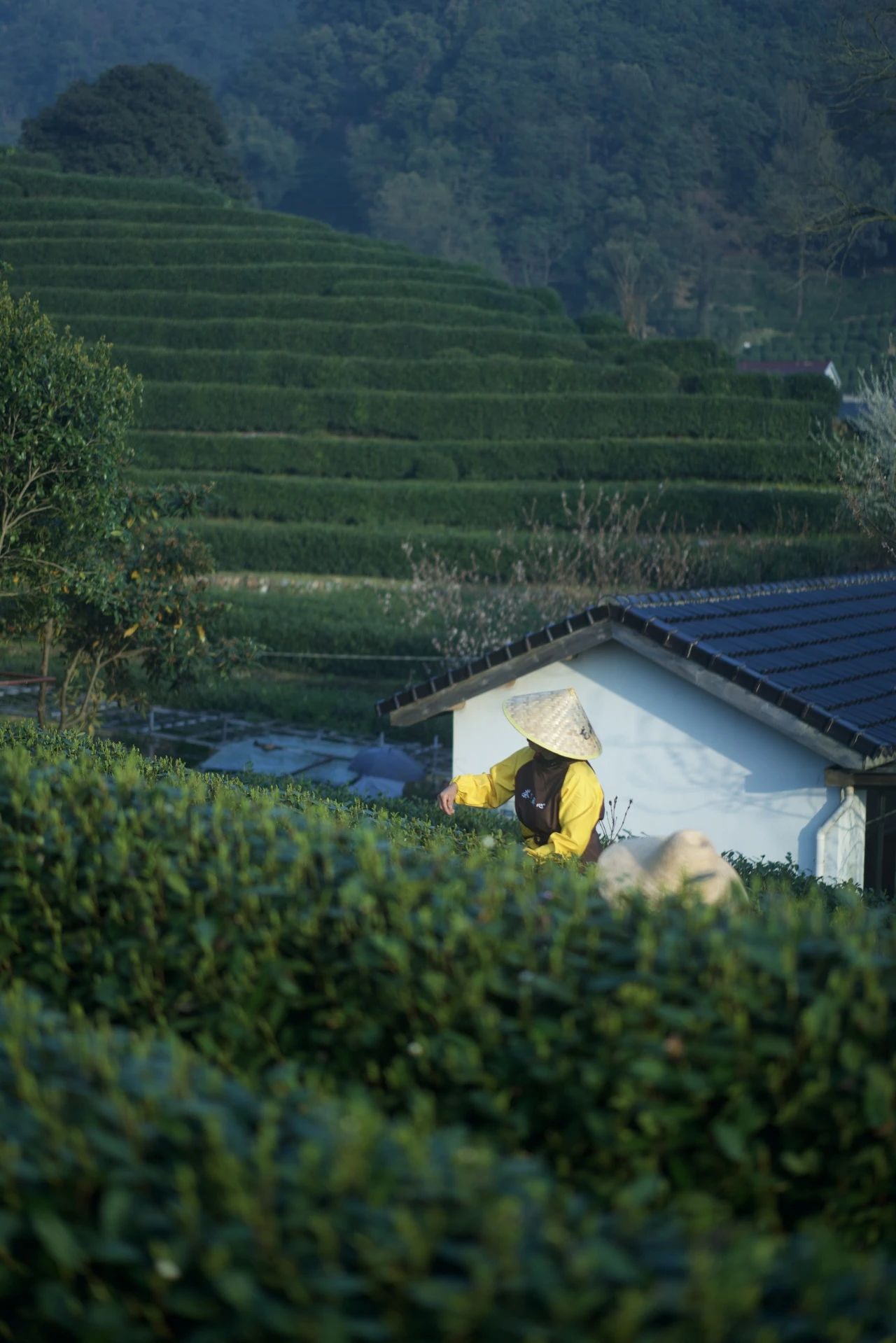 在龙井村连绵青翠的茶山里,嫩绿的芽孢悄然吐新,茶农们在茶园来回穿梭,忙着采摘新芽,单手轻轻一捻,鲜叶落入掌心,三五个之后再一起放进腰间的茶篓,不一会儿,篓里已呈现一片青绿。