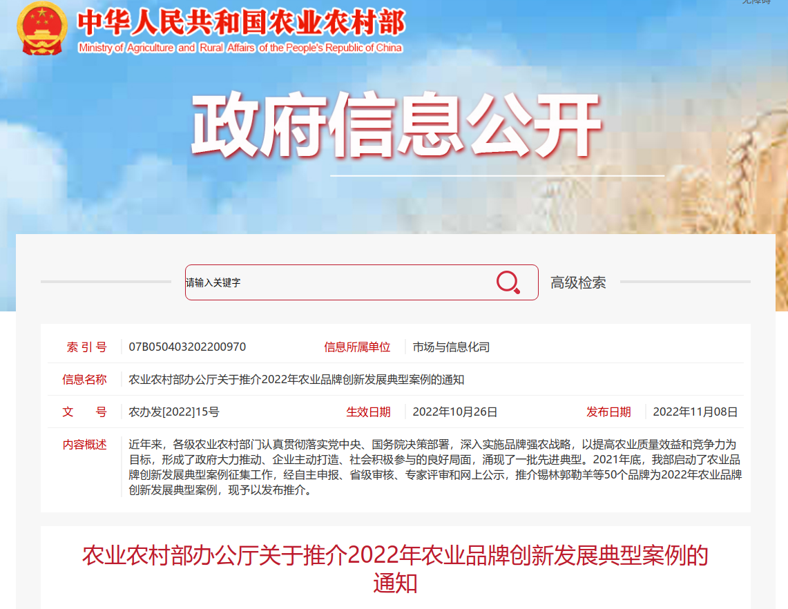 2021年以来,农业农村部启动了农业品牌创新发展典型案例征集工作,经自主申报、省级审核、专家评审和网上公示,最终发布推介50个品牌为2022年农业品牌创新发展典型案例。所推介的案例,重点体现了品牌主体在核心竞争力提升、品牌协同发展、品牌营销创新、品牌监管保护、品牌帮扶等方面的典型做法和成效,为推动农业品牌创新发展探索了路径,提供了经验,具有典型性、代表性和可借鉴性。