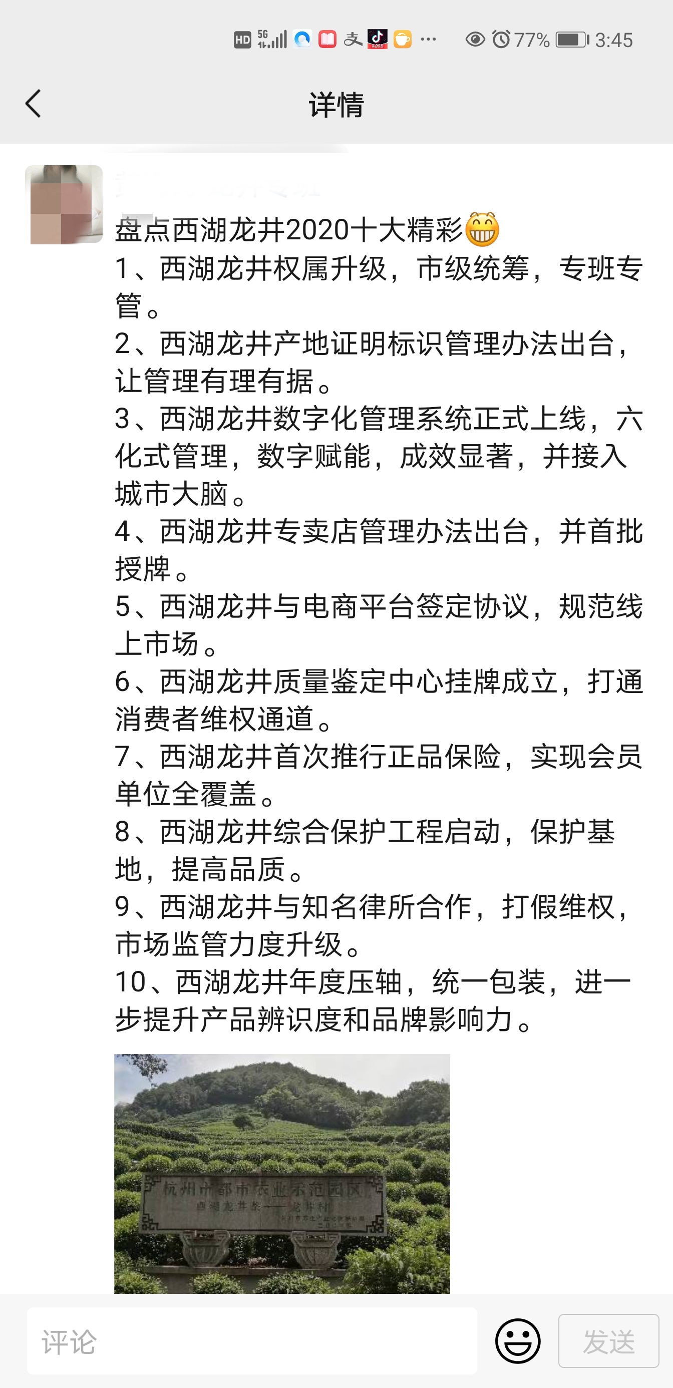 2020年是《办法》施行的第一年,作为副会长单位,见证了办法从构思到落实的点滴,协会从统计、收购、包装、销售等一系列出发点考虑,切实为保护西湖龙井茶考虑,多次聚拢行业龙头和专家举办专题会议和直播等为西湖龙井发声和宣传,对于西湖龙井的保护起到了关键的作用。