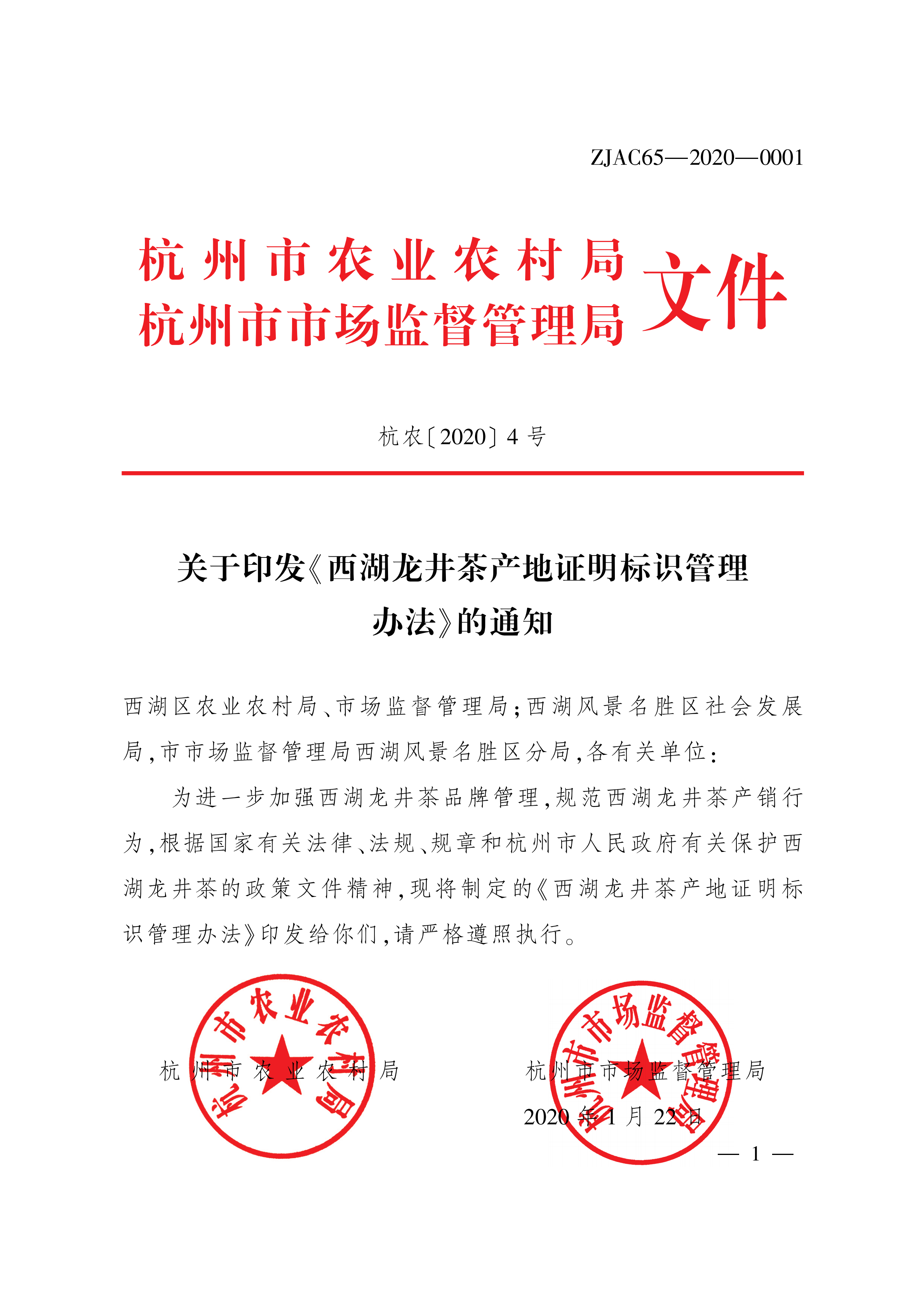 为了进一步加强西湖龙井茶品牌管理,规范西湖龙井茶产销行为,杭州市农业农村局、杭州市市场监督管理局在广泛征求意见的基础上,于2020年1月22日联合印发了《西湖龙井茶产地证明标识管理办法》。《办法》自2020年3月1日起正式实施。