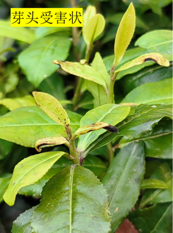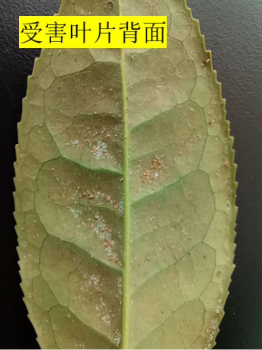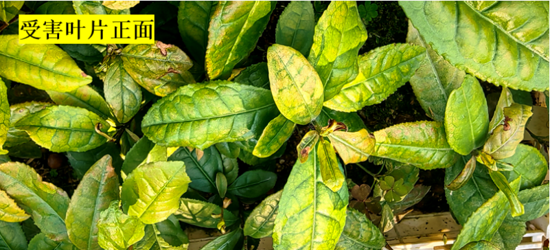 神泽叶螨属蝉螨目,叶螨科,可为害蔬菜、果树、茶树等多种植物,是一种重要的农业害螨。成螨、幼螨、若螨栖息于叶背刺吸茶树汁液为害茶树,受害部位明显黄化。