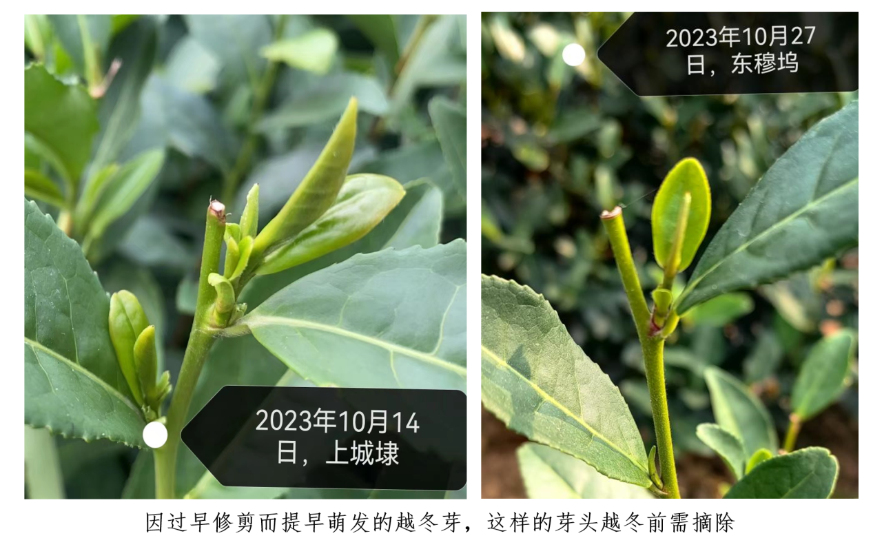 1.西湖龙井茶园秋季打顶修剪剪时间不能只凭老经验,需根据当时天气情况进行调整。23年秋季由于温度雨水充足,茶树长势旺,休眠时间推迟,按老经验在9月下旬10月初修剪的茶树普遍出现越冬芽提早萌发的现象,已萌发的芽头,哪怕躲过了冬季冻害,在这波寒潮中也会受冻。所以不要盲目提早修剪时间,需根据当时天气和自身茶园肥培情况调整修剪时间,没把握的宁迟勿早,放在10月中旬后进行打顶修剪。