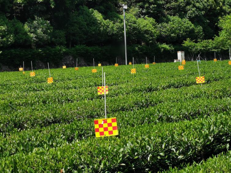 在浙江茶园,叶蝉在每年通常有两个高峰期,春茶后是叶蝉发生为害的第一个高峰期,如果不加控制,可严重影响修剪茶园的新梢生长。目前大部分西湖龙井茶园小贯小绿叶蝉的虫口基数不高,采用色板诱杀就可达到防控效果。即在茶园插放天敌友好型色板。天敌友好型色板采用了复合颜色设计,所用材料可降解,在保证叶蝉诱杀量的情况下可减少对天敌昆虫的诱杀。应用时每亩插放色板20-25张,色板高于茶蓬面20厘米左右,放置1个月左右移除,使用过的色板要及时清出茶园集中处理。
